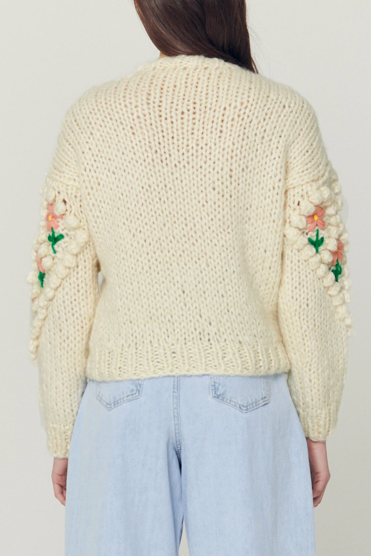 - This cardigan features a chunky knitted material all over, an floral embroidered design at front, a comfy fit silhouette, a jewel button detail, and button down closures at front