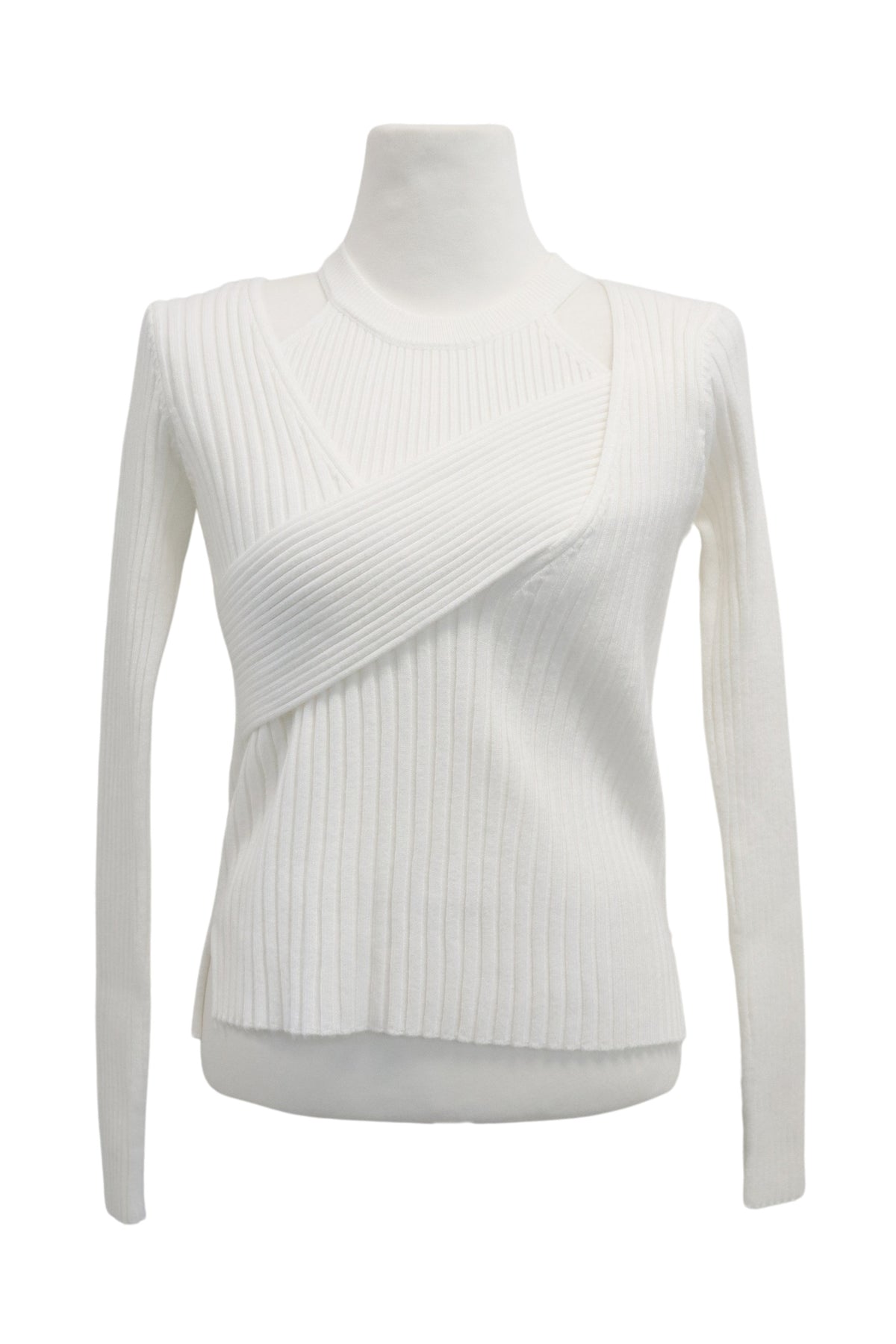 - Top: Wrap effect, ribbed knit, long sleeve