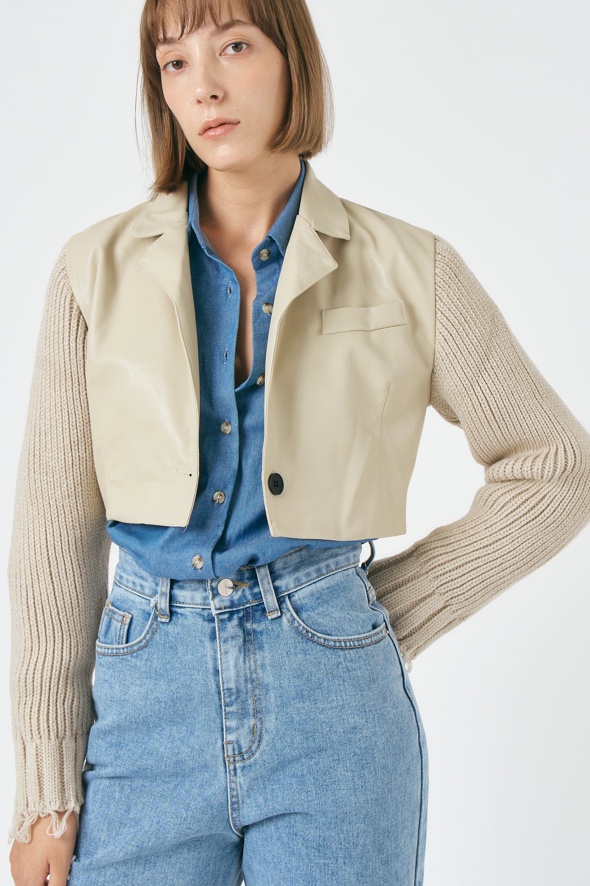 • Pleather cropped length blazer jacket with cable knitted sleeves