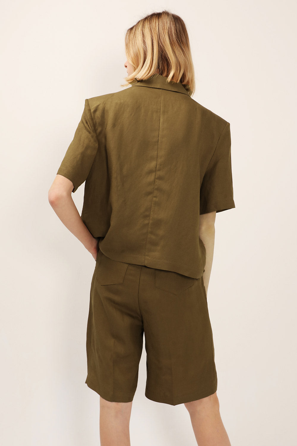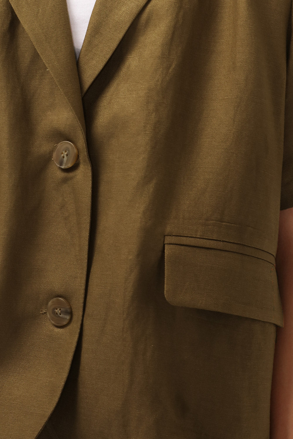 • This blazer features a linen blended material all over, a deliberately oversized padded shoulder silhouette detail, a notched lapel, short sleeves, dual flap pockets, and a single breasted silhouette