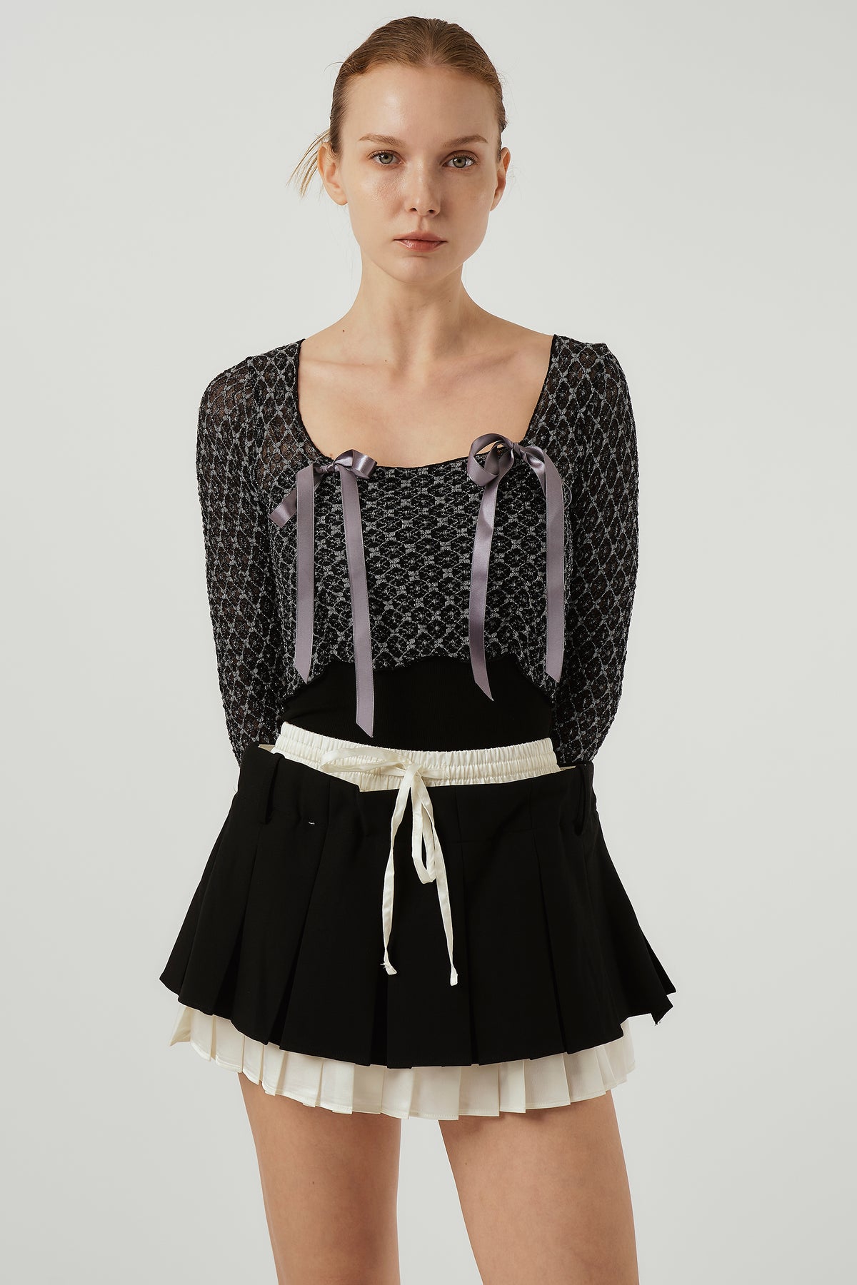 Model's height is 5′ 7″ (157cm) Bust 31in Waist 23in Hip 34in and wearing S/M