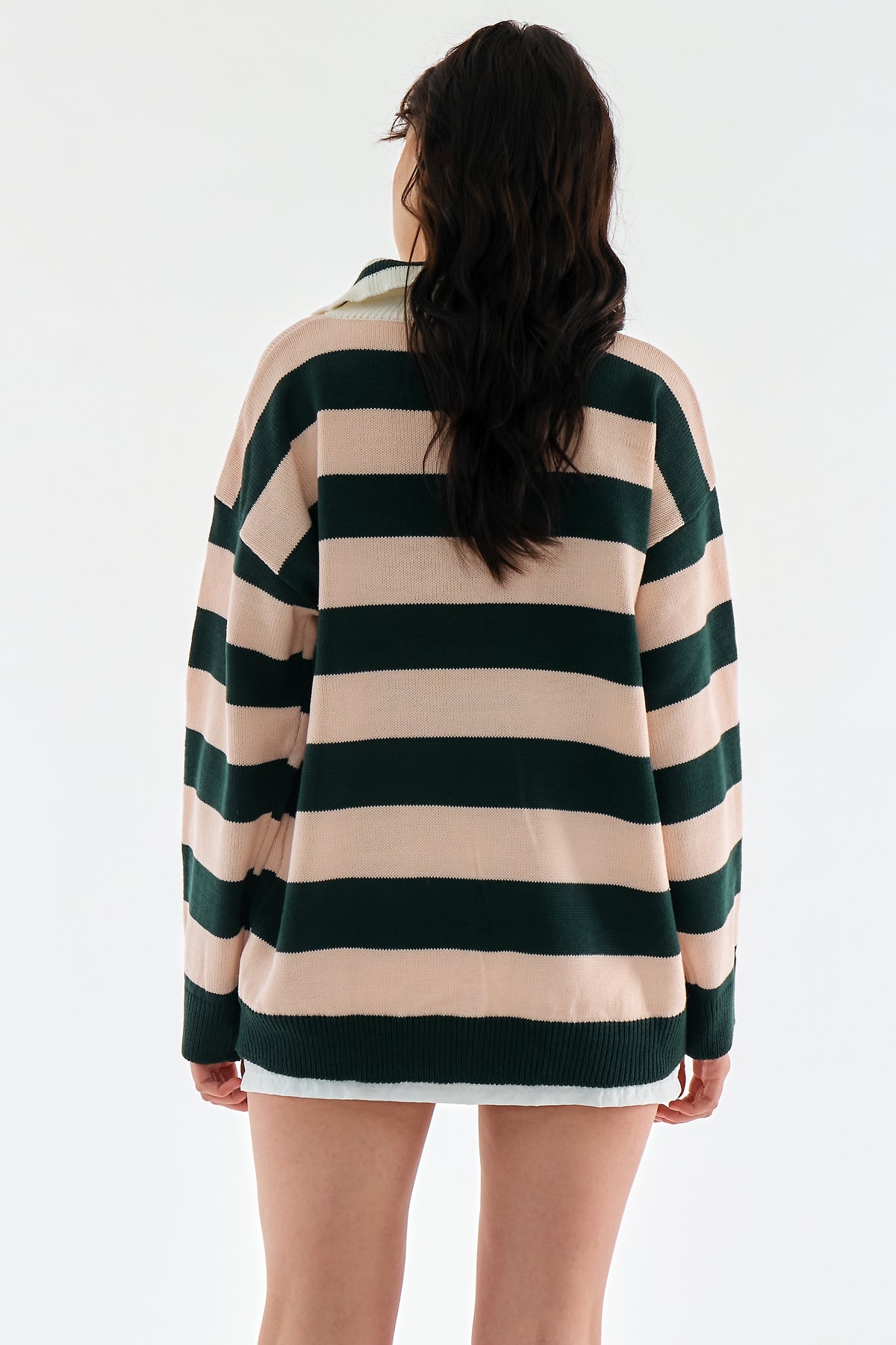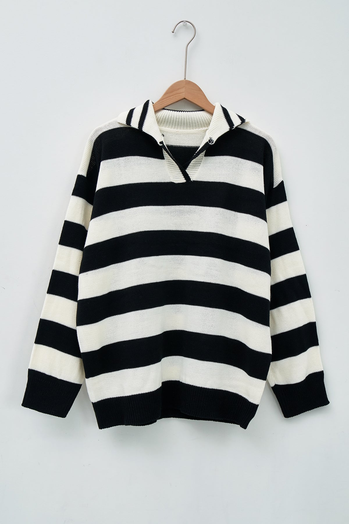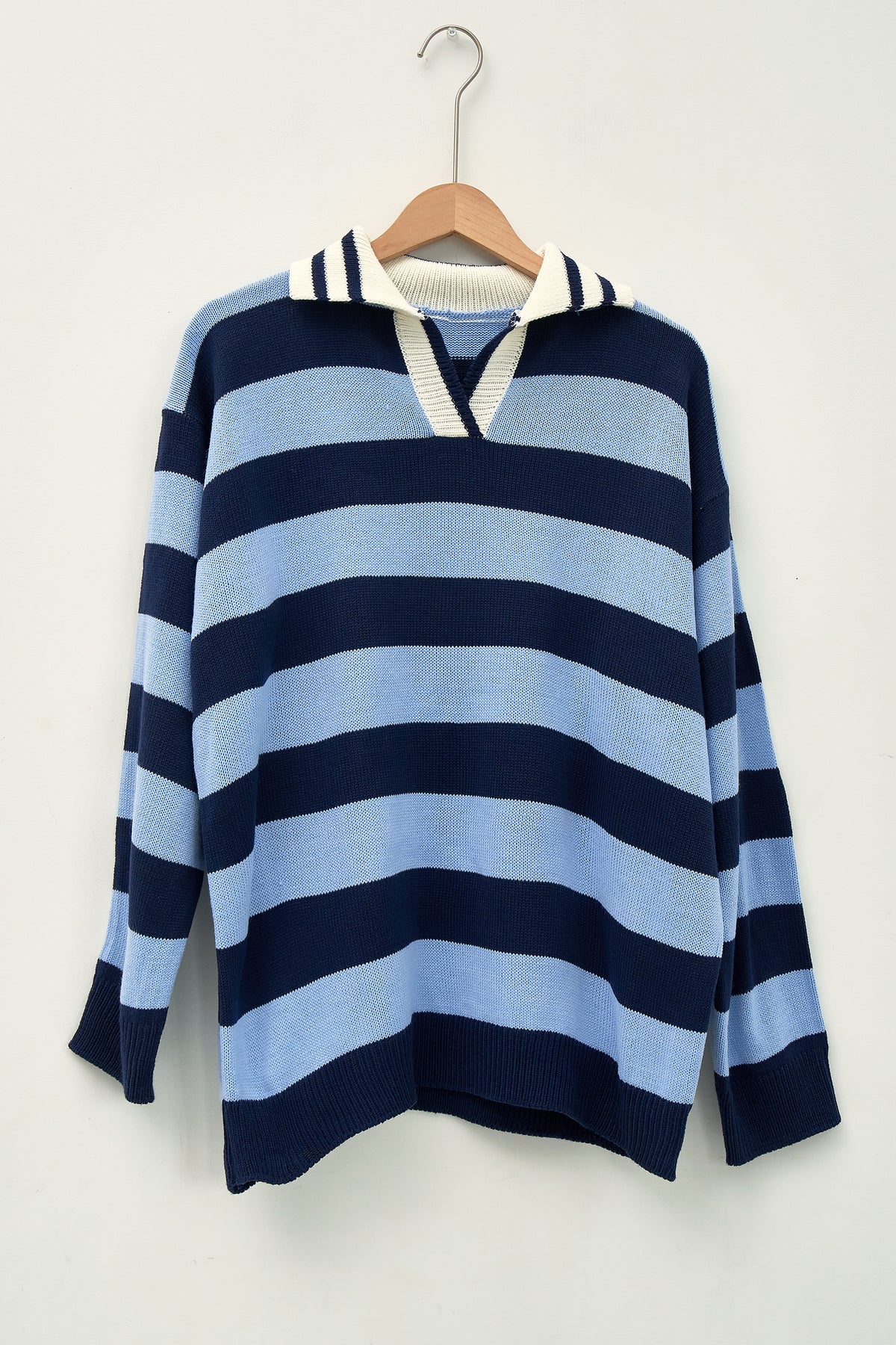 Stay on trend with the Rosy Stripe Collar Sweater! This oversized sweater features stylish stripes that are totally on point. Perfect for staying cozy and chic, this sweater is a must-have addition to your wardrobe.