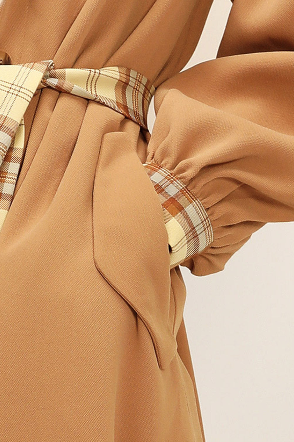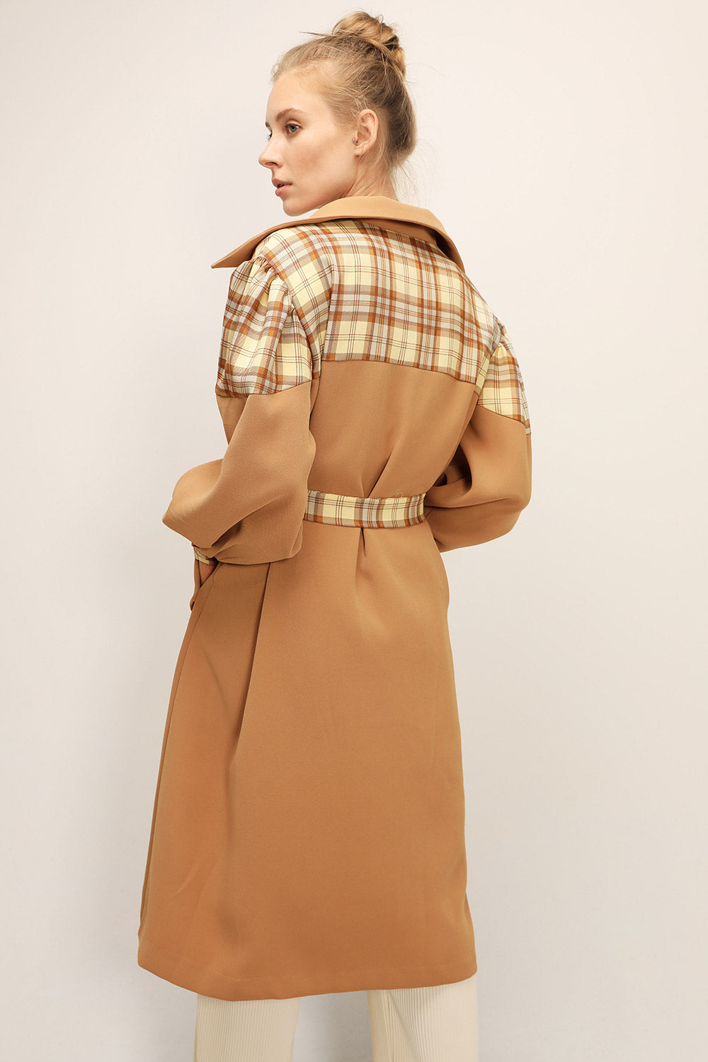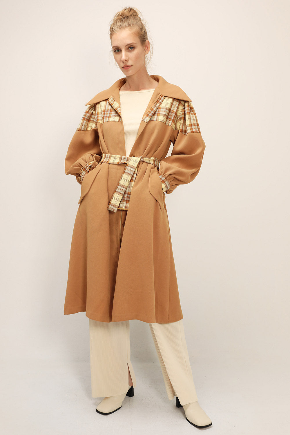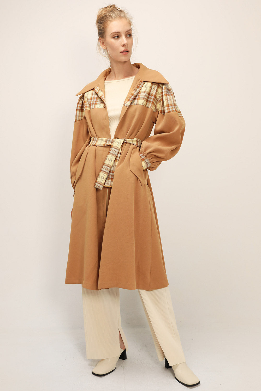 - This coat features a plaid check block detail, a wide collar, puffed long sleeves, an under-knee length silhouette, dual pockets, button down closures at front, and a fabric belt included